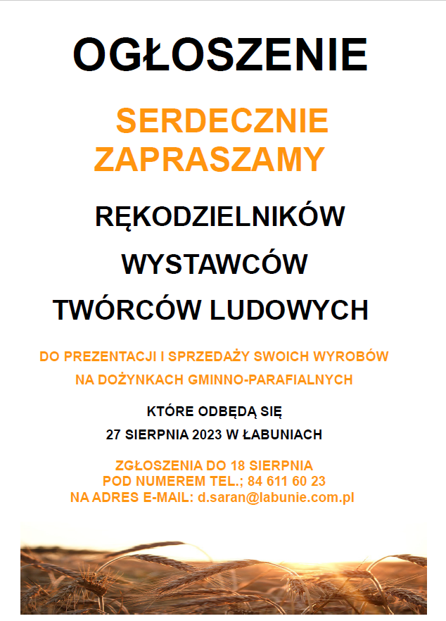 W związku z organizacją imprezy. która odbędzie się w niedzielę, 27 sierpnia w Łabuniach, zapraszamy firmy oraz osoby prywatne, które zajmują się rękodziełem i chcą zareklamować oraz sprzedać swoje produkty – do wystawienia ich na Dożynkach Gminnych w Łabuniach.