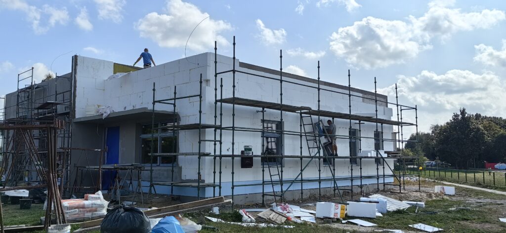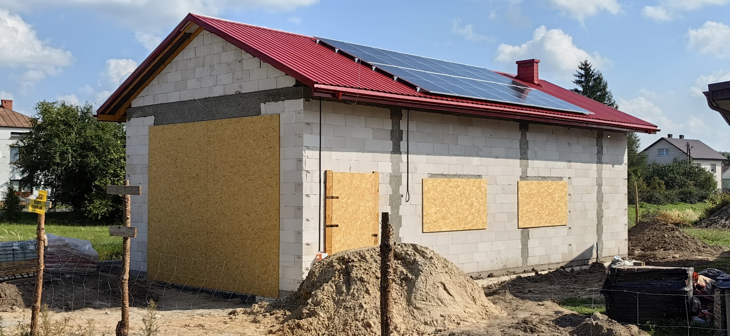 Obok boiska przy ul. Parkowej powstaje budynek o powierzchni ponad 330 m. kw. Będzie miał garaż na 3 stanowiska, salę szkoleniową i pomieszczenia socjalne oraz magazyn. Obiekt będzie ogrzewany przy pomocy pompy ciepła.