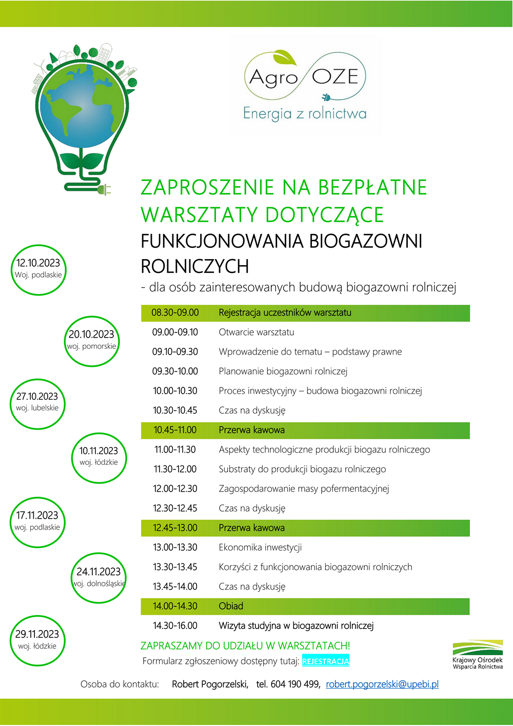 W formularzu zgłoszeniowym (link w dalszej części informacji) znajdują się daty i miejscowości, w których odbędą się szkolenia, a dokładny adres miejsca warsztatów oraz biogazowni (uczestnicy warsztatów będą mieli możliwość obejrzenia instalacji do produkcji biogazu rolniczego!), w której będzie wizytacja, otrzymają Państwo w mailu po dokonaniu zgłoszenia uczestnictwa w wybranym wydarzeniu.
