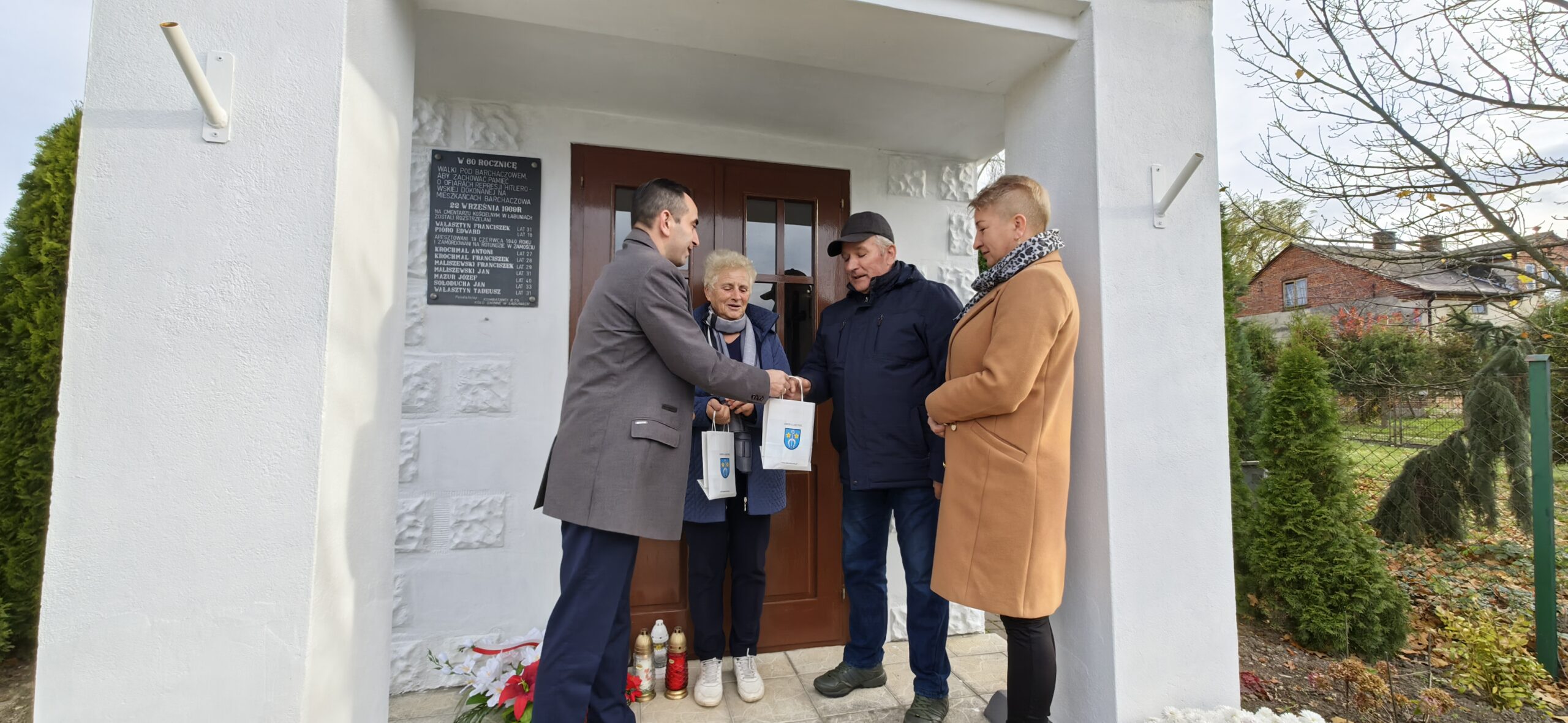 Wójt Gminy Łabunie – Mariusz Kukiełka oraz Przewodnicząca Rady Gminy Łabunie – Elżbieta Kuźma w piątek, 10 listopada w miejscach pamięci złożyli wieńce i zapalili znicze w miejscach pamięci. Jedno z nich znajduje się w Barchaczowie przy Izbie Muzealnej. To kapliczka upamiętniająca pomordowanych mieszkańców Barchaczowa 22 września 1939 r. Tegoroczne oddanie hołdu było połączone z podziękowaniami dla mieszkańców Barchaczowa, którzy na co dzień dbają o to miejsce pamięci, a ostatnio – w czynie społecznym – odnowili również kapliczkę przeprowadzając jej remont. Wójt Gminy Łabunie i Przewodnicząca Rady Gminy podziękowali za wykonane prace Pani Marii Murmydłowskiej, Panu Stanisławowi Murmydłowskiemu, Pani Bogusławie Sołoducha oraz Panu Emialianowi Sołoducha.