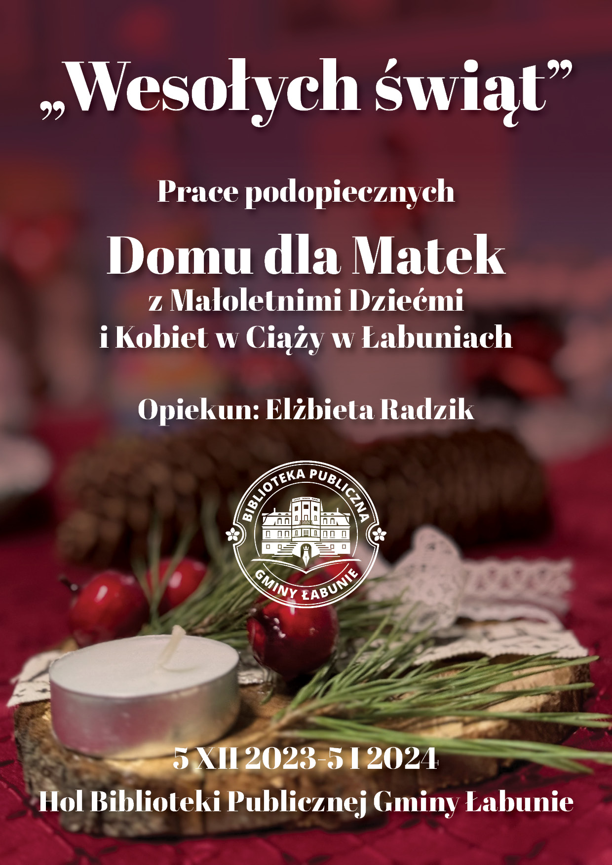 W holu biblioteki w Łabuniach można oglądać w grudniu prace podopiecznych Domu dla Matek z Małoletnimi Dziećmi i Kobiet w Ciąży w Łabuniach. Są to dekoracje świąteczne powstałe pod kierunkiem opiekun Elżbiety Radzik. Zapraszamy.
