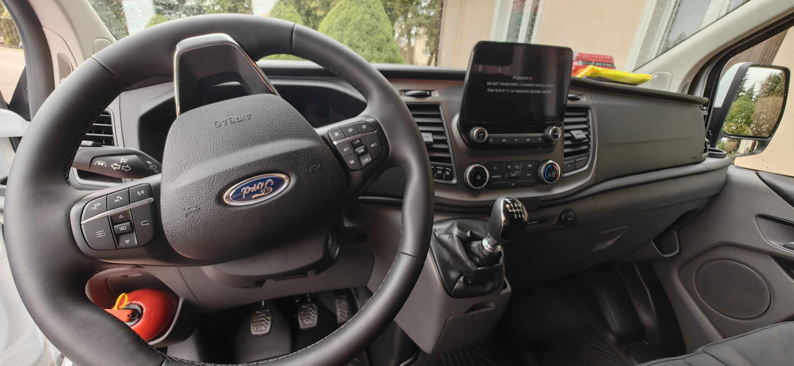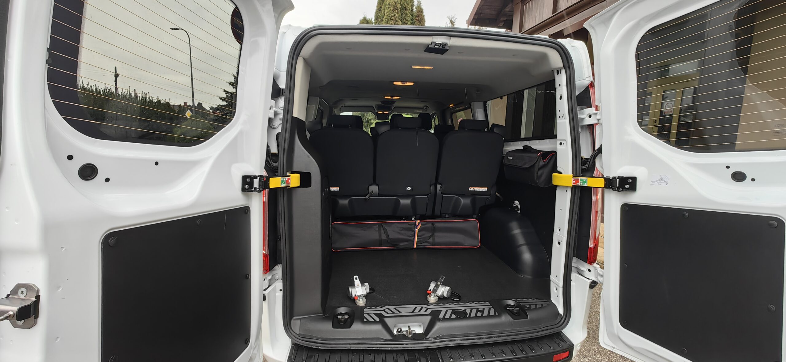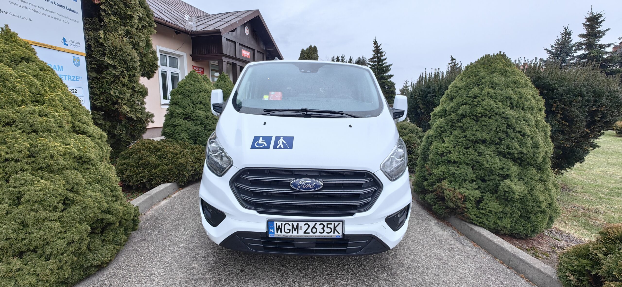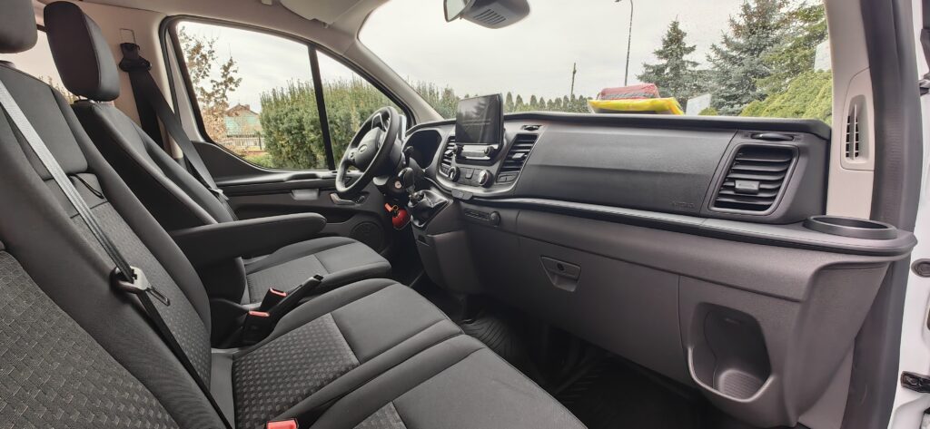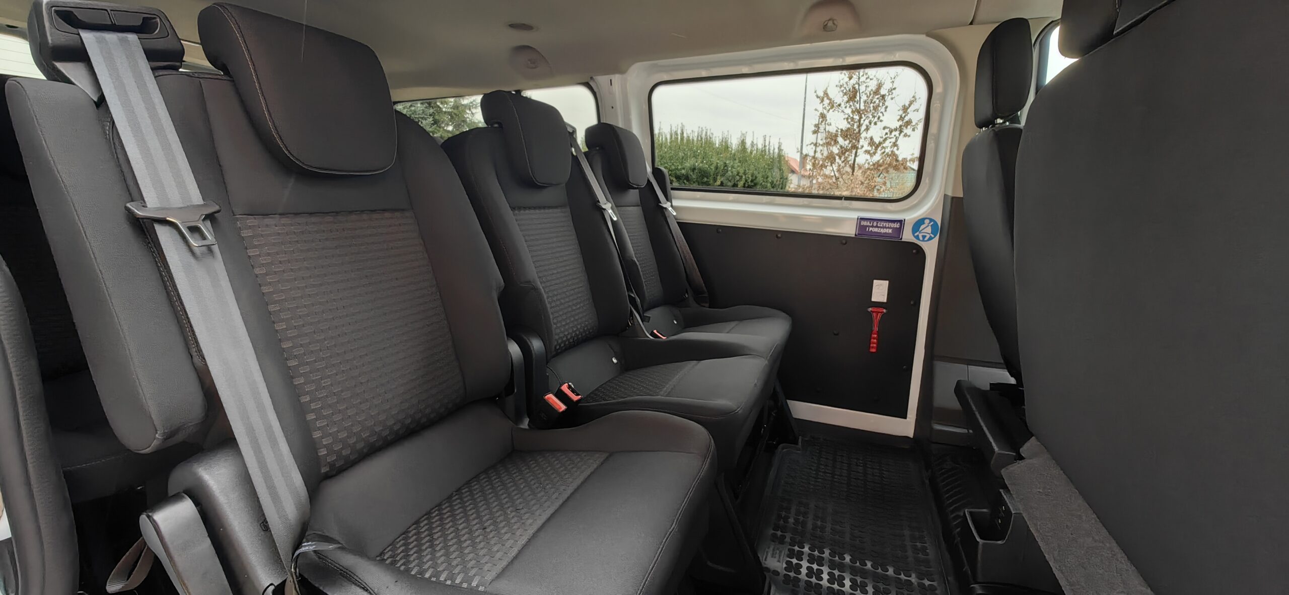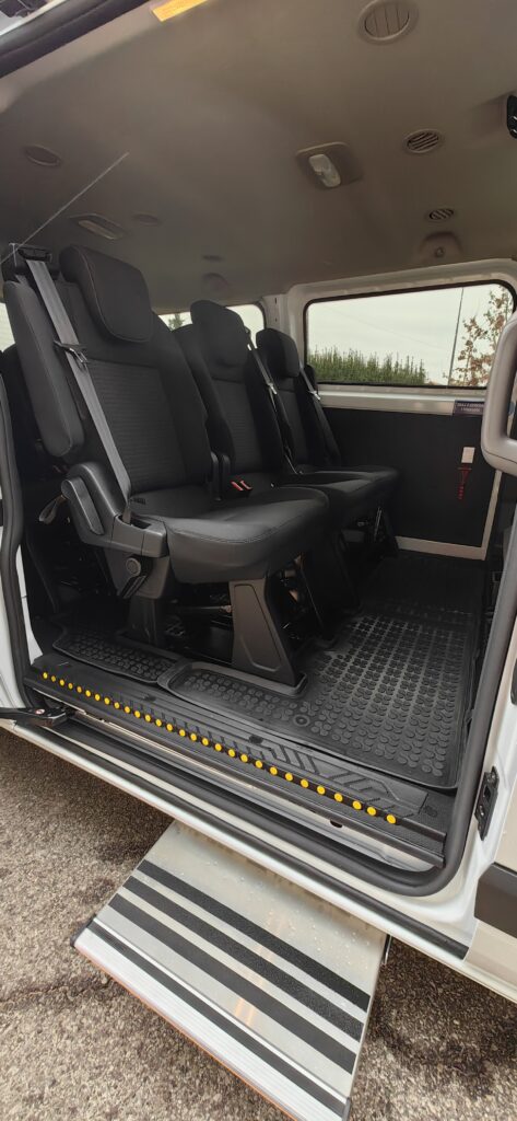To mikrobus marki Ford Transit z 9-cioma miejscami siedzącymi z dodatkowym miejscem dla osoby na wózku inwalidzkim, który wjedzie do auta dzięki specjalnym najazdom.