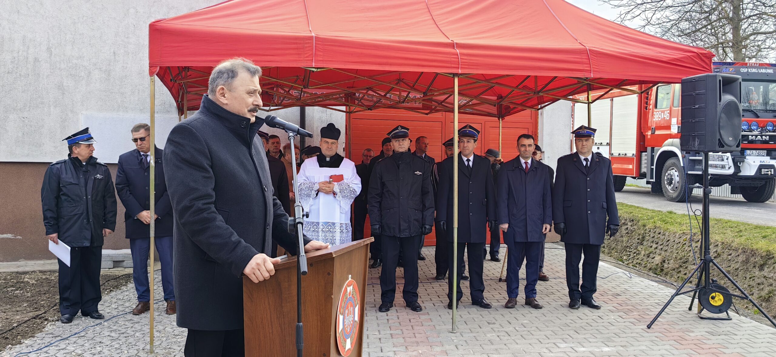 Podczas uroczystości były przemówienia zaproszonych gości. Głos zabrali: Radny Sejmiku Województwa Lubelskiego – Krzysztof Gałaszkiewicz, Wiceprezes Oddziału Powiatowego ZOSP RP w Zamościu – st. bryg. Jacek Sobczyński, Komendant Miejskiej Państwowej Straży Pożarnej w Zamościu – mł. bryg. Przemysław Ilczuk, V-ce Przewodniczący Rady Powiatu Zamojskiego – Antoni Skura oraz Wójt Gminy Łabunie – Mariusz Kukiełka, który podziękował instytucjom oraz osobom zaangażowanym w pomoc i koordynację przy pozyskaniu środków zewnętrznych, a także budowie garażu w Wólce Łabuńskiej.Na koniec głos zabrał Prezes OSP Wólka Łabuńska – dh Zbigniew Żuk, który przedstawił historię powstania nowego garażu.