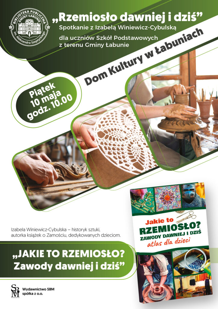 Biblioteka Publiczna Gminy Łabunie zaprasza uczniów łabuńskich szkół podstawowych 10 maja 2024 r. do Domu Kultury w Łabuniach na spotkanie z Izabelą Winiewicz-Cybulską – historyk sztuki, autorką książek o Zamościu, dedykowanych dzieciom.