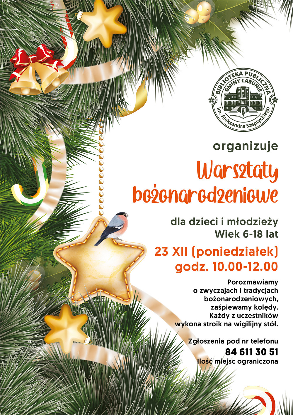 Biblioteka Publiczna Gminy Łabunie zaprasza dzieci i młodzież na warsztaty bożonarodzeniowe.