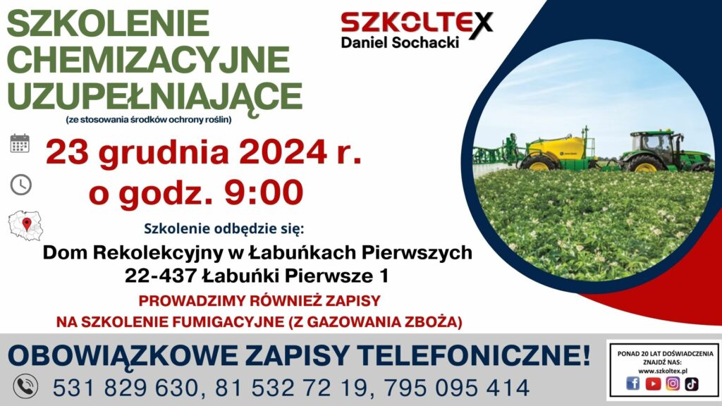 Na prośbę firmy Szkoltex publikujemy informację o szkoleniu chemizacyjnym dla rolników.