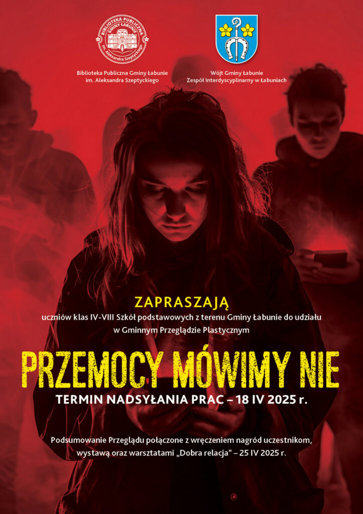 Biblioteka Publiczna Gminy Łabunie oraz Wójt Gminy Łabunie – Zespół Interdyscyplinarny w Łabuniach zapraszają do udziału w Gminnym Przeglądzie Plastycznym “Przemocy mówimy nie”. Wydarzenie skierowane jest do uczniów klas IV-VIII szkół podstawowych z terenu Gminy Łabunie.
