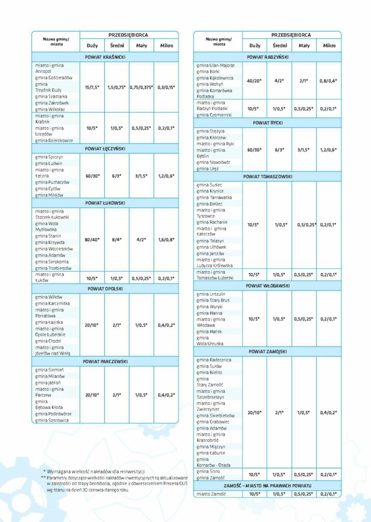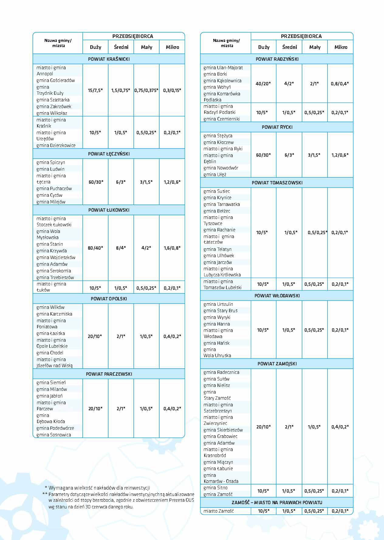 Zwolnienia podatkowe CIT i PIT dotyczą firm produkcyjnych i przetwórczych z gminy Łabunie, które planują nową inwestycję (zakup gruntów, budowa hal), lub które chcą rozwijać swoją działalność (np wprowadzając nowy produkt, kupując kolejne maszyny czy urządzenia, rozbudowując zakład).