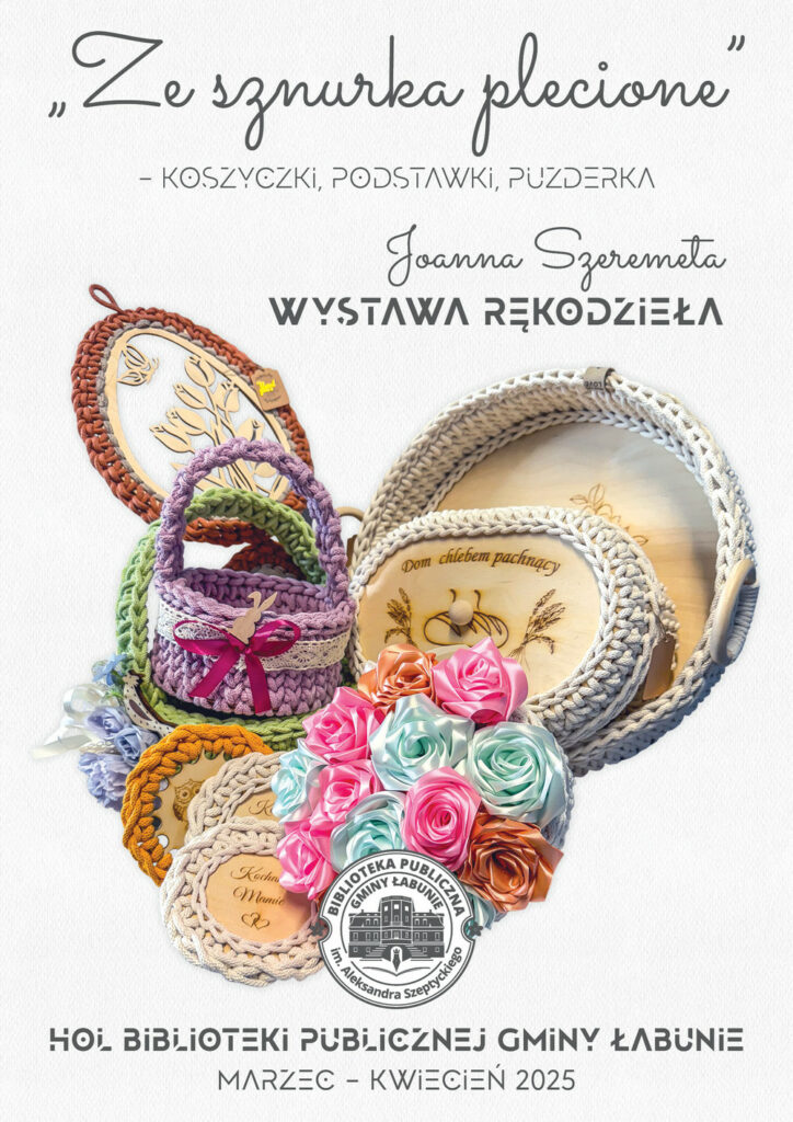 Biblioteka w Łabuniach zaprasza na kolejną wystawę – prezentację lokalnego twórcy – Pani Joanna Szeremeta z Łabuń wykonuje piękne plecione koszyczki ze sznurka. – szczegóły na plakacie.