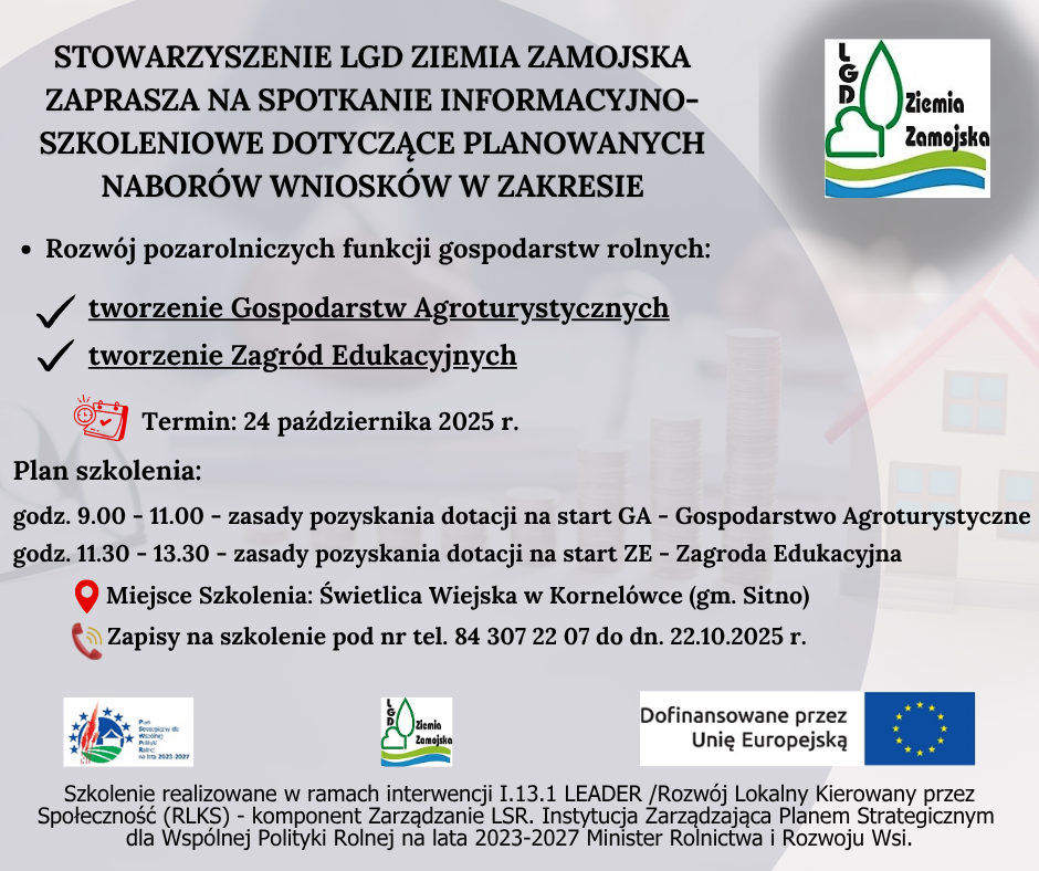 Stowarzyszenie LGD Ziemia Zamojska planuje 24.10.2025 r. szkolenie w zakresie – Rozwój pozarolniczych funkcji gospodarstw rolnych: tworzenie Gospodarstw Agroturystycznych, tworzenie Zagród Edukacyjnych na terenie LGD Ziemia Zamojska. Szczegóły na plakacie.