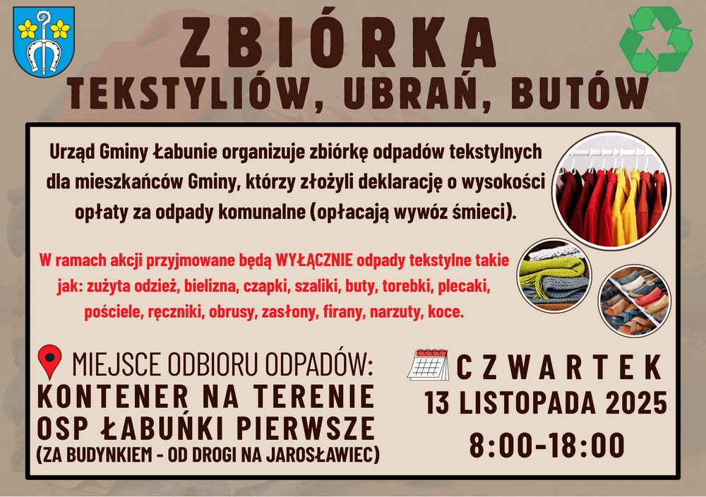 Urząd Gminy Łabunie organizuje zbiórkę odpadów tekstylnych dla mieszkańców Gminy, którzy złożyli deklarację o wysokości opłaty za gospodarowanie odpadami komunalnymi (opłacają wywóz śmieci).