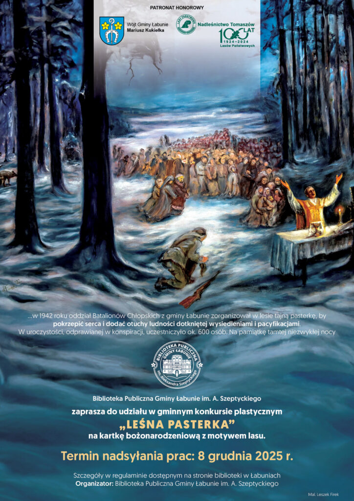 … W 1942 roku, w trudnych czasach okupacji, oddział Batalionów Chłopskich gminy Łabunie zorganizował w lesie konspiracyjną pasterkę. Była to chwila nadziei i wspólnoty – pokrzepienie serc w mrocznych czasach wysiedleń i pacyfikacji. Dziś, wspominając tamto wydarzenie, chcemy połączyć tradycję, historię i artystyczną wrażliwość.