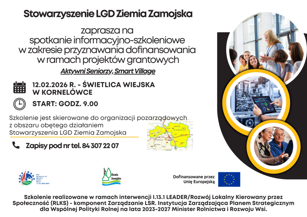 Stowarzyszenie LGD Ziemia Zamojska zaprasza organizacje pozarządowe na spotkanie dotyczące możliwości pozyskania dofinansowania na projekty grantowe “Aktywni Seniorzy” i “Smart Village”. Szczegóły na plakacie.
