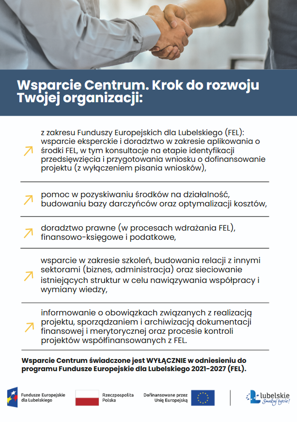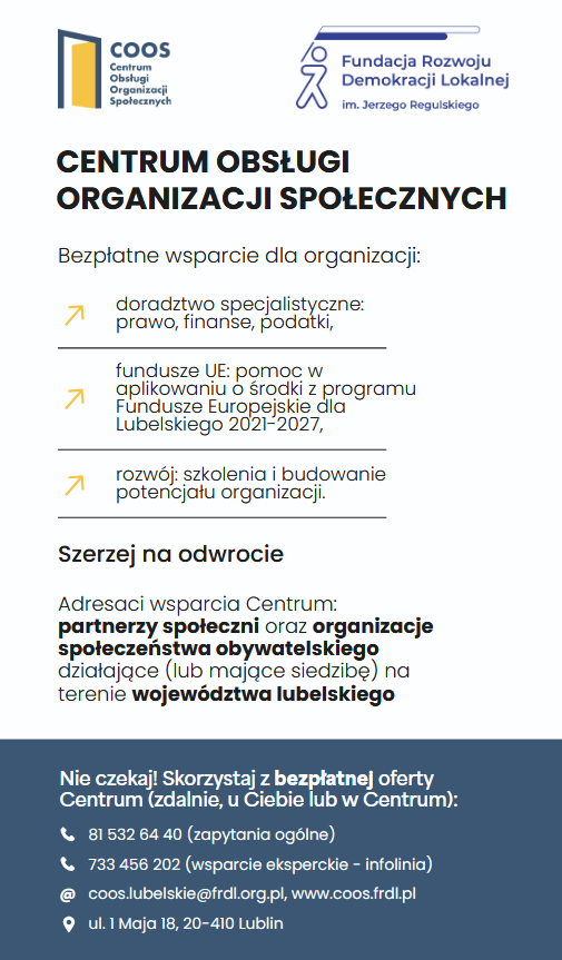 Urząd Marszałkowski Województwa Lubelskiego w Lublinie w ramach programu „Fundusze Europejskie dla Lubelskiego 2021-2027” (FEL 2021-2027) realizuje usługę świadczoną przez Centrum Obsługi Organizacji Społecznych.