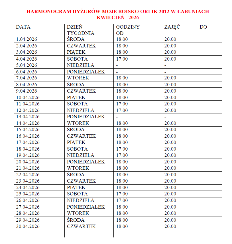 Po zimowej przerwie otwieramy boisko Orlik w Łabuniach. Publikujemy harmonogram otwarcia w miesiącu kwietniu.