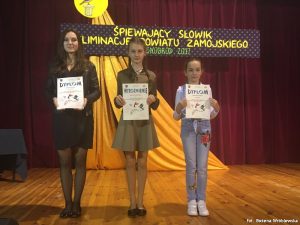 W eliminacjach powiatowych w Krasnobrodzie do Konkursu Piosenki Dziecięcej i Młodzieżowej “Śpiewający słowik 2017” wzięły udział trzy solistki reprezentujące naszą gminę: Agata Niemczuk – ZS Łabuńki Pierwsze, Martyna Śliwińska i Kamila Wróblewska – ZS Łabunie. Wyróżnienie otrzymała Kamila Wróblewska, która wykonała piosenkę “Kolorowy wiatr”.
