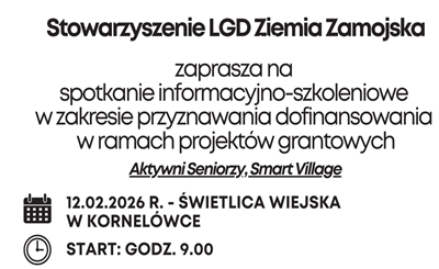 Stowarzyszenie LGD Ziemia Zamojska zaprasza organizacje pozarządowe na spotkanie dotyczące możliwości pozyskania dofinansowania na projekty grantowe "Aktywni Seniorzy" i "Smart Village". Szczegóły na plakacie.