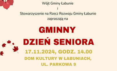 Stowarzyszenie na Rzecz Rozwoju Gminy Łabunie oraz Wójt Gminy Łabunie - Mariusz Kukiełka zapraszają na Gminny Dzień Seniora. Program wydarzenia i szczegóły dotyczące zapisów - na plakacie.