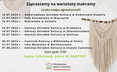 W imieniu Stowarzyszenia Lokalna Grupa Działania Ziemia Zamojska zapraszamy na warsztaty z makramy - 31 lipca w Izbie Muzealnej w Barchaczowie.