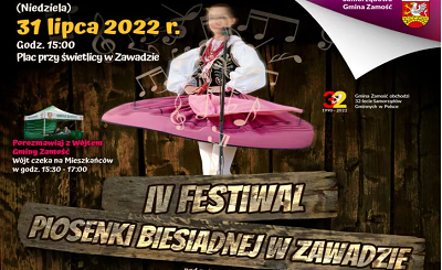 Samorząd Gminy Zamość serdecznie zaprasza do udziału w IV Festiwalu Piosenki Biesiadnej – Zawada 2022. Festiwal ma charakter konkursu dla wokalno-muzycznych zespołów lub solistów.