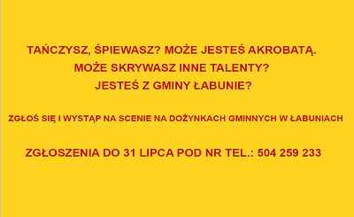 Tańczysz lub śpiewasz? Może jesteś akrobatą? Masz talent i pasję w tym co robisz? Jesteś z Gminy Łabunie i chcesz pokazać swój talent? Zgłoś się, a wystąpisz na scenie na Dożynkach Gminnych w Łabuniach.