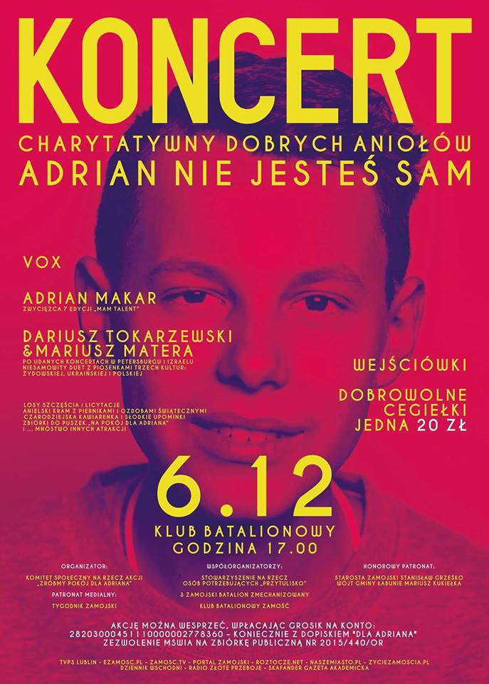 Wójt Gminy Łabunie, Przewodnicząca Rady Gminy Łabunie i Komitet Społeczny na Rzecz Akcji “Zróbmy pokój dla Adriana” zapraszają 6 grudnia do Klubu Batalionowego na koncert charytatywny Dobrych Aniołów.