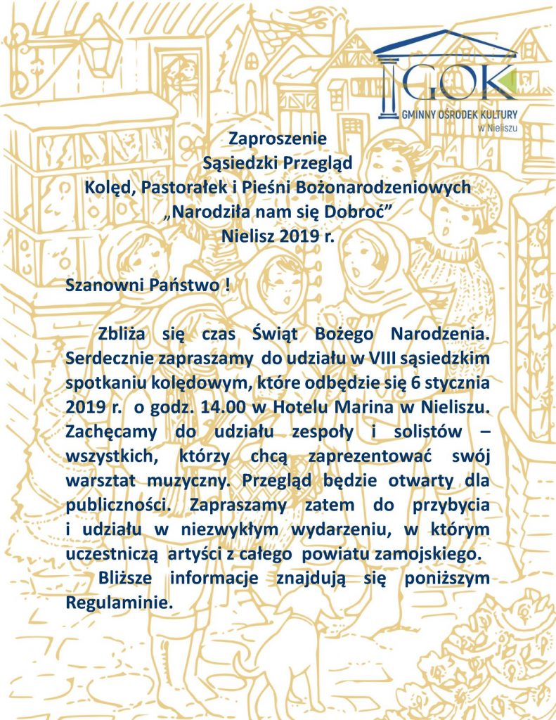Gminny Ośrodek Kultury w Nieliszu zaprasza do udziału w Sąsiedzkim Konkursie Kolęd, Pastorałek i Pieśni Bożonarodzeniowych „Narodziła nam się Dobroć”. Nielisz 2019 r. Regulamin i karty zgłoszenia dostępne w załączniku poniżej.