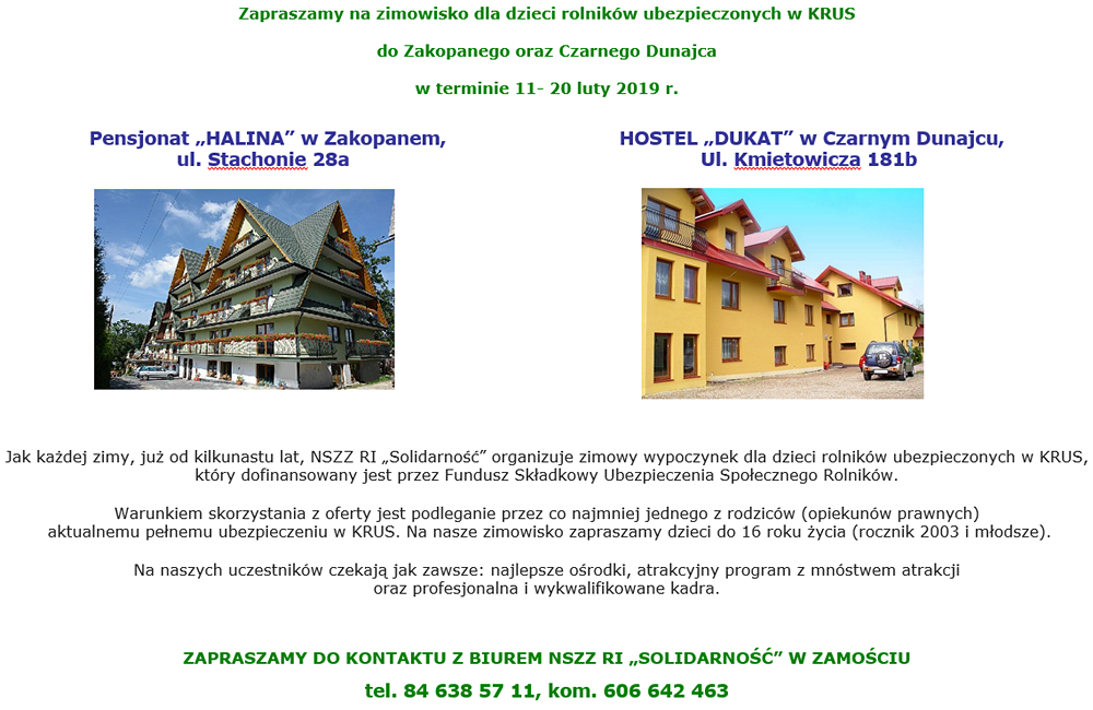 NSZZ RI „Solidarność” organizuje zimowy wypoczynek dla dzieci rolników ubezpieczonych w KRUS, który dofinansowany jest przez Fundusz Składkowy Ubezpieczenia Społecznego Rolników. Warunkiem skorzystania z oferty jest podleganie przez co najmniej jednego z rodziców (opiekunów prawnych) aktualnemu pełnemu ubezpieczeniu w KRUS. Zimowisko organizator zaprasza dzieci do 16 roku życia (rocznik 2003 i młodsze).