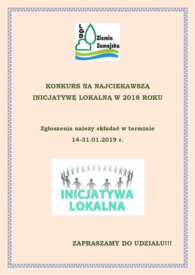 Stowarzyszenie Lokalna Grupa Działania „Ziemia Zamojska” ogłasza konkurs na najciekawszą inicjatywę lokalną w 2018 r. Zgłoszenia przyjmujemy w terminie 14-31.01.2019 r.