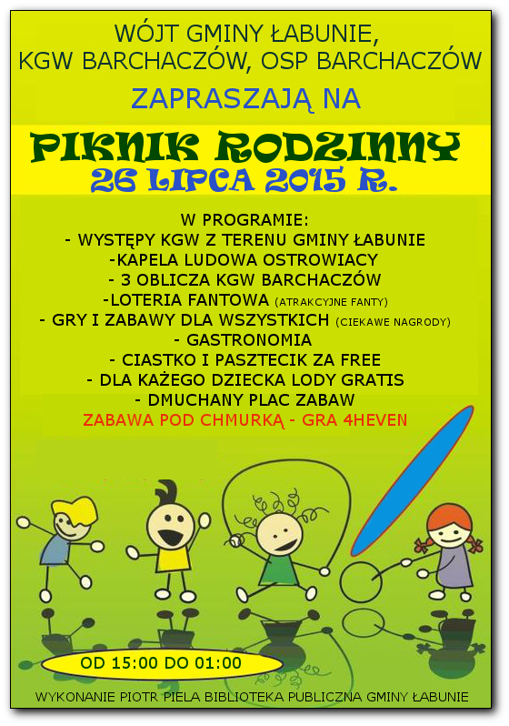 Wójt Gminy Łabunie, KGW Barchaczów i OSP Barchaczów zapraszają 26 lipca 2015 r. na Piknik Rodzinny.