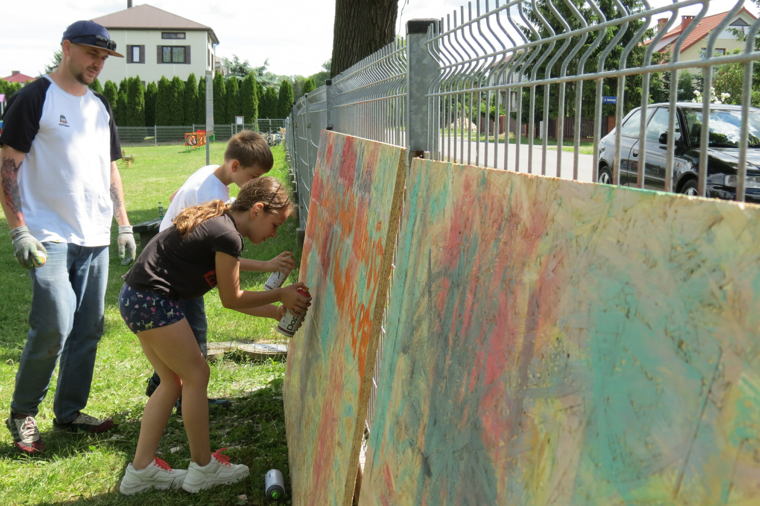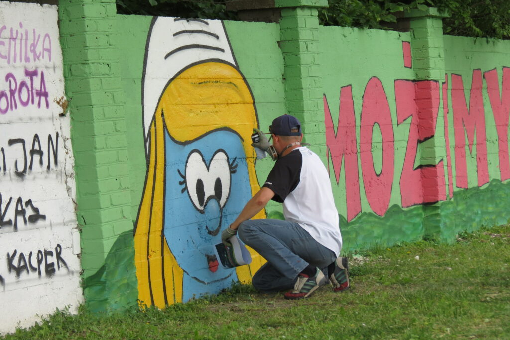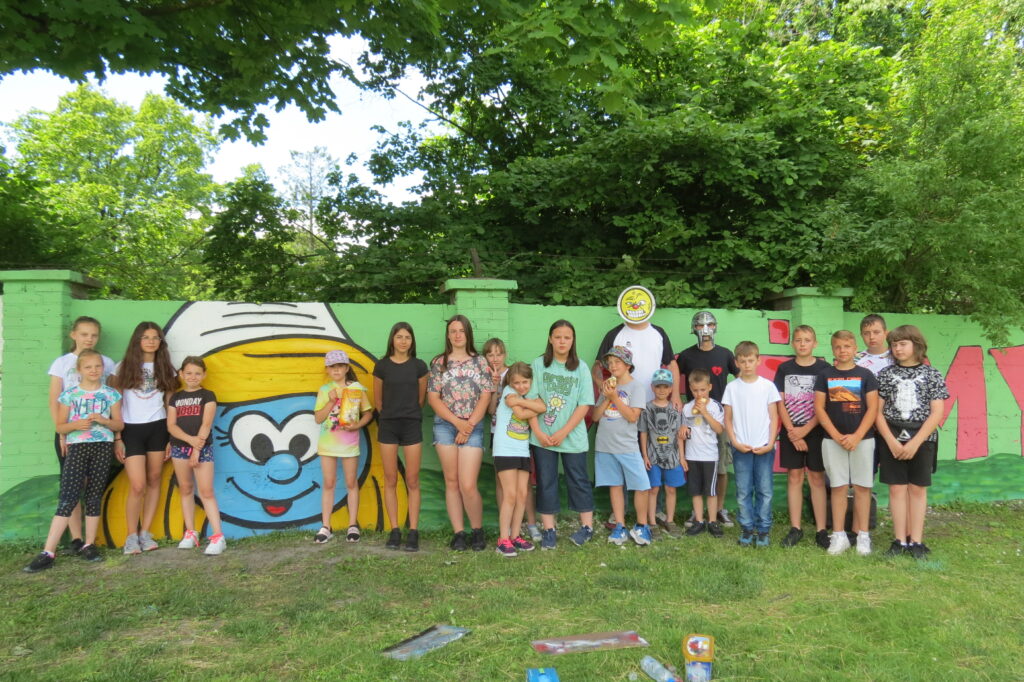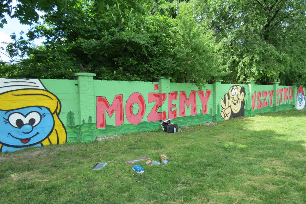 Tegoroczne warsztaty odbyły się w dniach 22 i 23 czerwca. Uczestnicy zmalowali kolejną część bajkowego graffiti na murze przy placu zabaw w Łabuniach. Szare płyty betonowe – dzięki dzieciom i młodzieży z gminy Łabunie – zyskały kolorowy blask, rozweselając plac zabaw. Pierwszego dnia warsztatów uczestnicy poznali w teorii technikę sztuki street art a potem – zabrali się za malowanie muralu. Kolejny dzień to już zabawa ze sprayami. Znana grupa Stforky z Zamościa razem z uczestnikami zmalowała postaci z bajki “Smerfy”. Dzieciaki mogły również liczyć na ciepły posiłek, słodki poczęstunek i napoje.