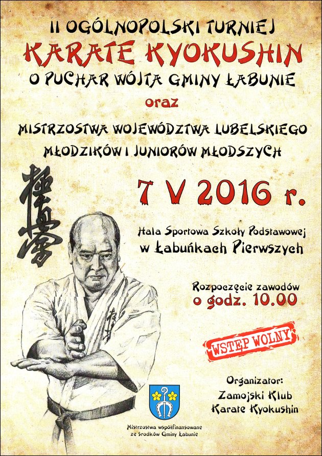Zamojski Klub Karate Kyokushin zaprasza 7 maja 2016 r. do hali sportowej przy Szkole Podstawowej i Gimnazjum w Łabuńkach Pierwszych na Ogólnopolski Turniej Karate Kyokushin o Puchar Wójta Gminy Łabunie oraz Mistrzostwa Województwa Lubelskiego Młodzików i Juniorów Młodszych.