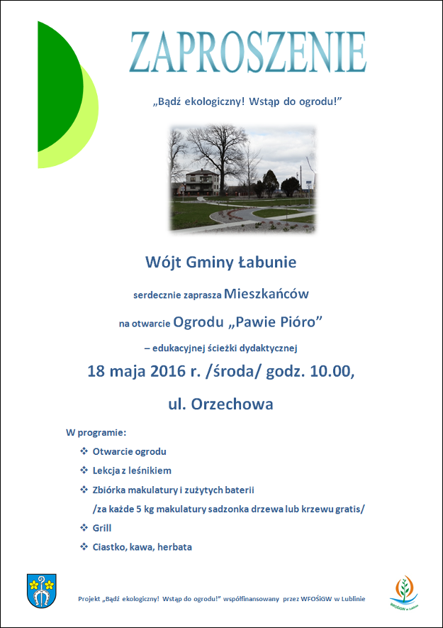 Wójt Gminy Łabunie serdecznie zaprasza Mieszkańców 18 maja 2016 r. (środa) o godz. 10.00 na otwarcie Ogrodu „Pawie Pióro” – edukacyjnej ścieżki dydaktycznej przy ul. Orzechowej.