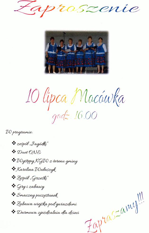Wójt Gminy Łabunie, KGW i Rada Sołecka w Mocówce zapraszają 10 lipca od godz. 16:00 na piknik rodzinny.