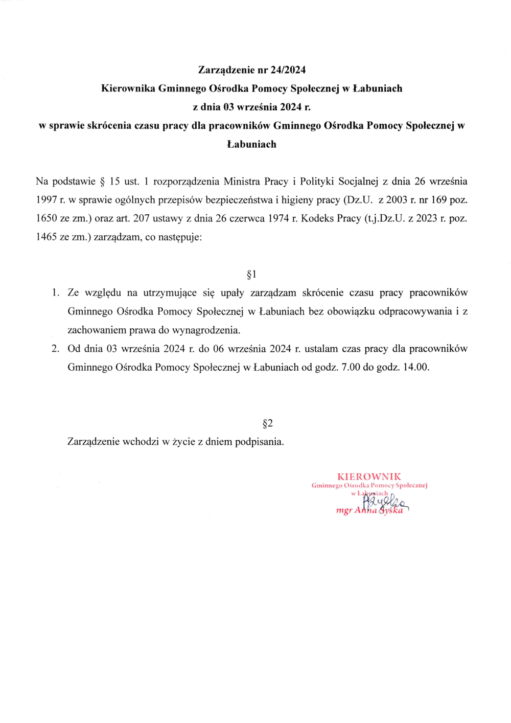 Od 3 do 6 września 2024 r. z powodu upałów Gminny Ośrodek Pomocy Społecznej w Łabuniach będzie czynny w godzinach od 7:00 do 14:00.