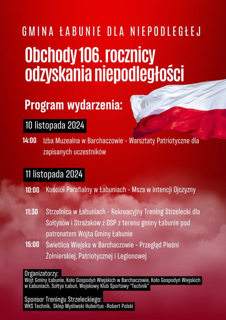 Zapraszamy do wzięcia udziału w gminnych obchodach 106. rocznicy odzyskania przez Polskę Niepodległości. Szczegóły na plakacie.