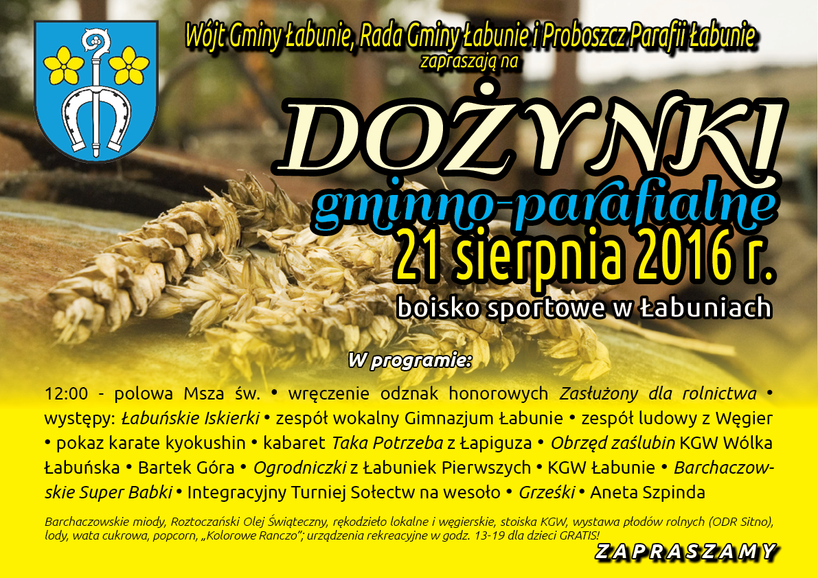 Wójt Gminy Łabunie, Rada Gminy Łabunie i Proboszcz Parafii Łabunie zapraszają 21 sierpnia 2016 r. na dożynki gminno-parafialne.