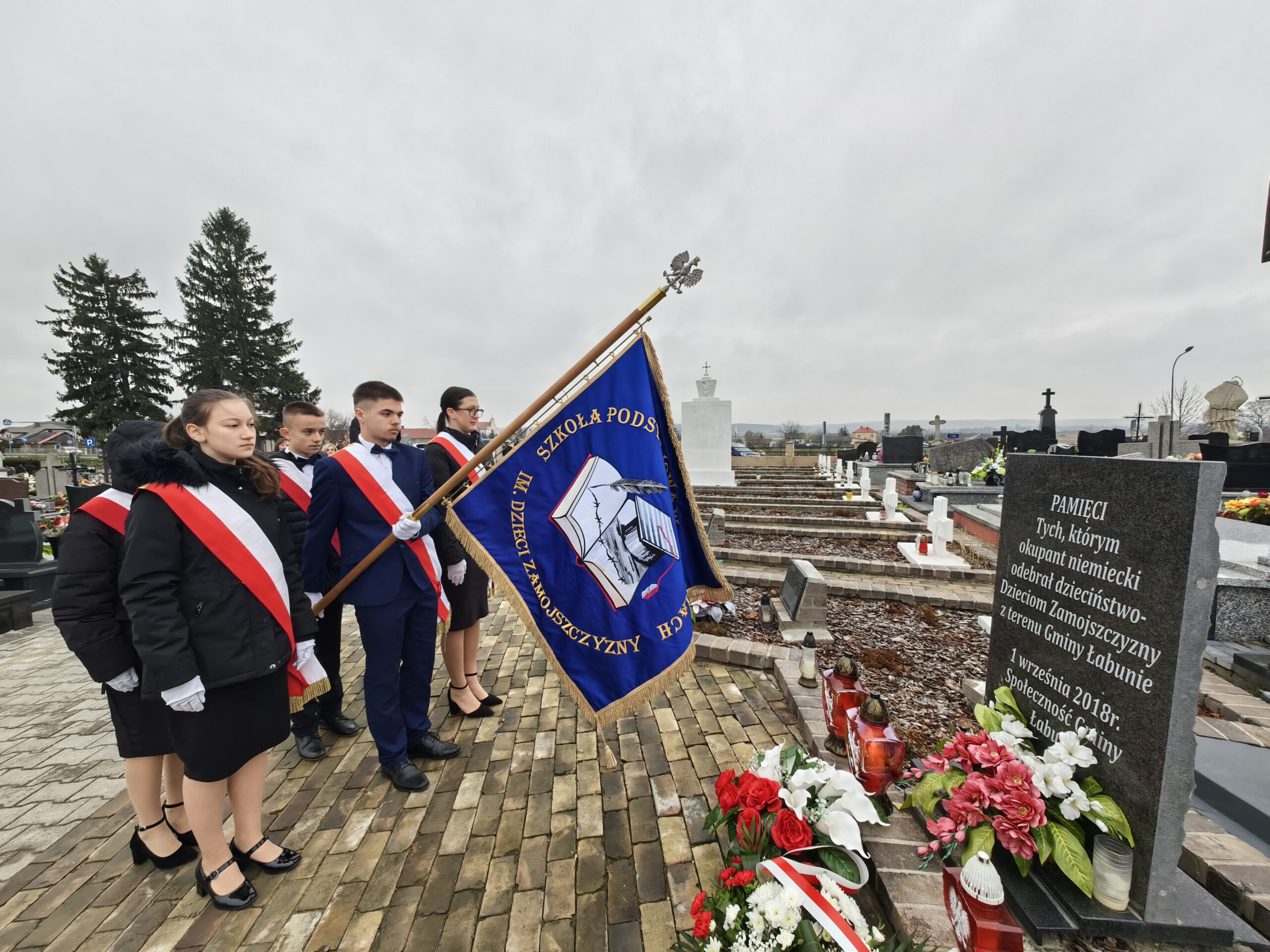 Udział w uroczystościach wzięli: Wójt Gminy Łabunie – Mariusz Kukiełka, Przewodnicząca Rady Gminy – Elżbieta Kuźma, dyrektor Zespołu Szkolnego w Łabuniach – Barbara Banaszkiewicz, poczty sztandarowe: szkolne, strażackie, Światowego Związku Żołnierzy Armii Krajowej Okręg Zamość Koło Rejonowe w Łabuniach oraz mieszkańcy gminy Łabunie.