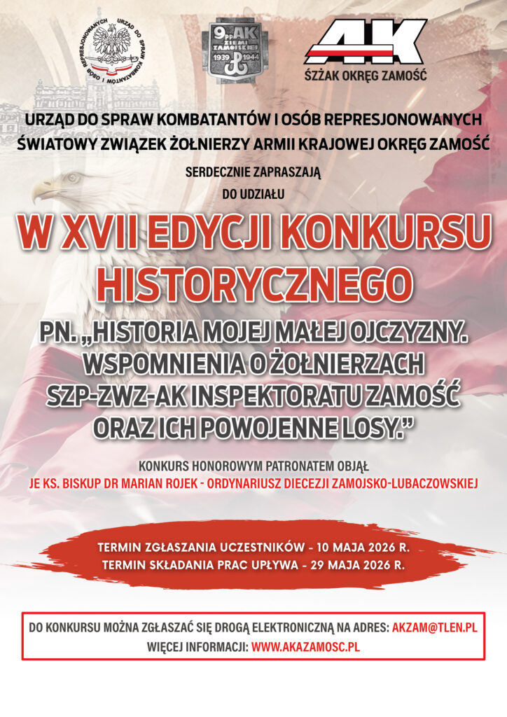 Światowy Związek Żołnierzy Armii Krajowej Okręg Zamość zaprasza do udziału w XVII edycji konkursu historycznego pn. ,,Historia mojej małej Ojczyzny. Wspomnienia o żołnierzach SZP-ZWZ-AK Inspektoratu Zamość oraz ich powojenne losy”.