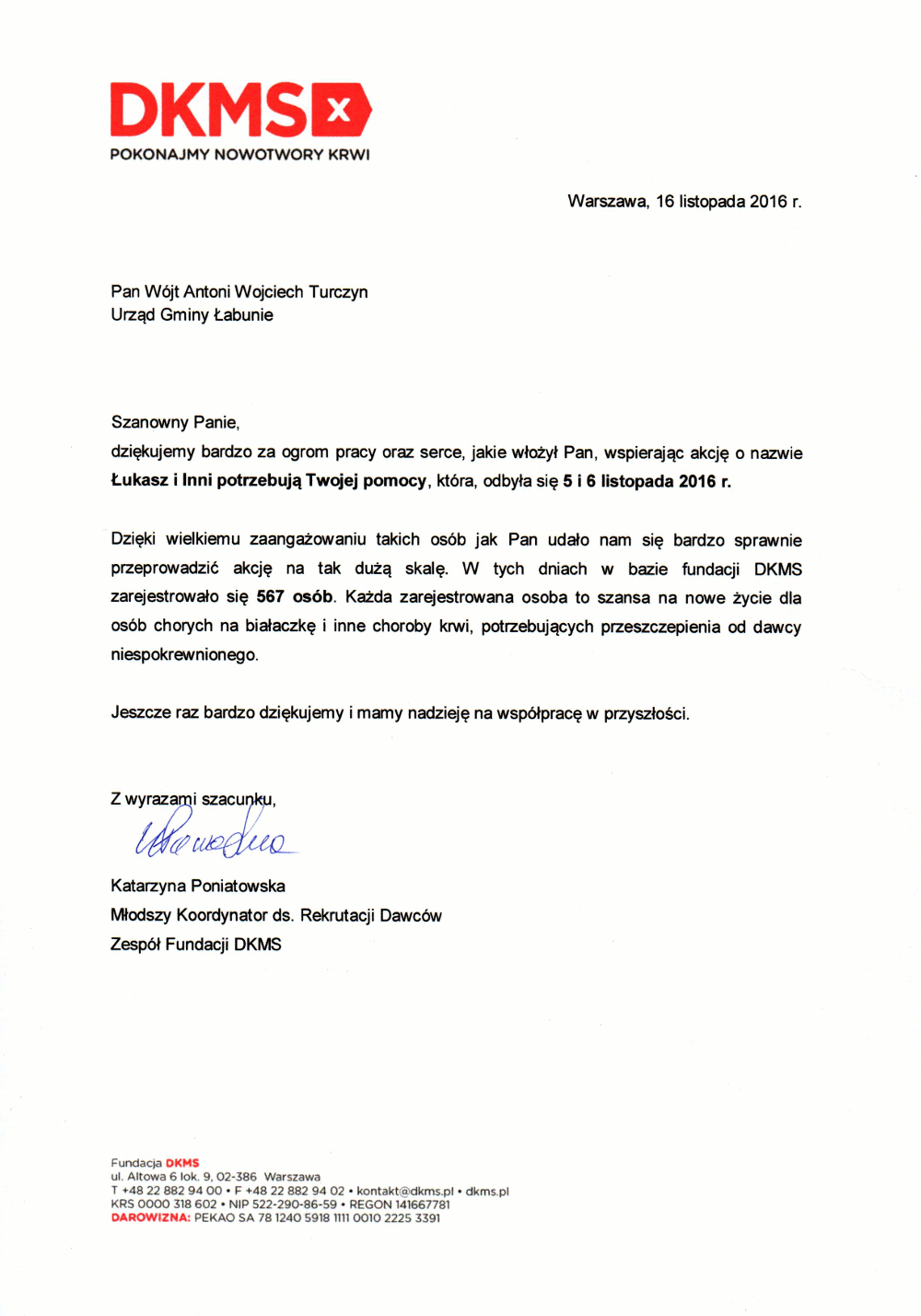 Fundacja DKMS przesyła podziękowania za wsparcie akcji “Łukasz i inni potrzebują Twojej pomocy”.