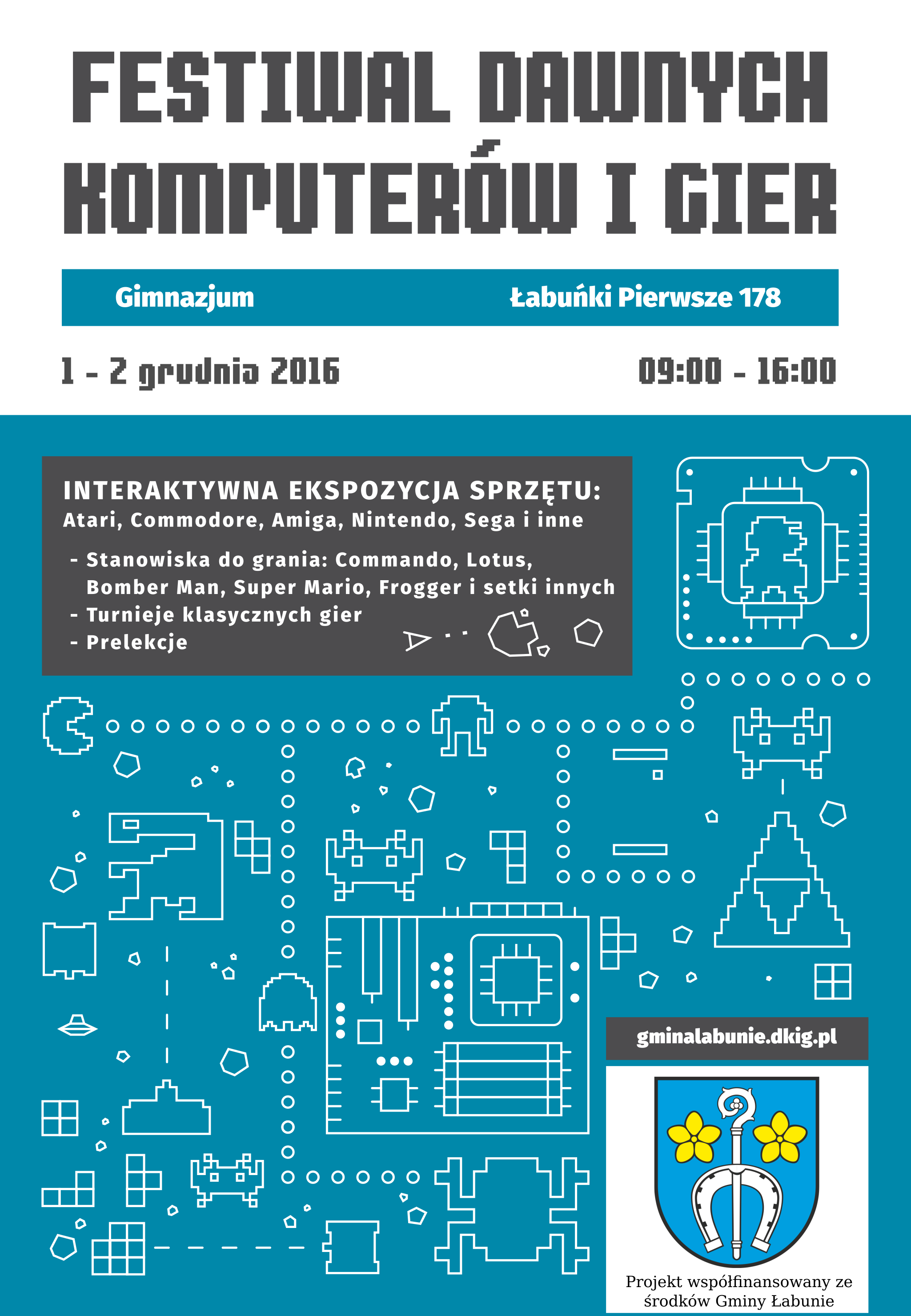 Wójt Gminy Łabunie, Dyrekcja Zespołów Szkół, Fundacja Promocji Retroinformatyki “Dawne Komputery i Gry” z Wrocławia zapraszają mieszkańców gminy na “Festiwal Dawnych Komputerów i Gier – Łabunie 2016”, który odbędzie się w Zespole Szkół w Łabuńkach Pierwszych w dniach 1-2 grudnia w godz. 9- 16.00.