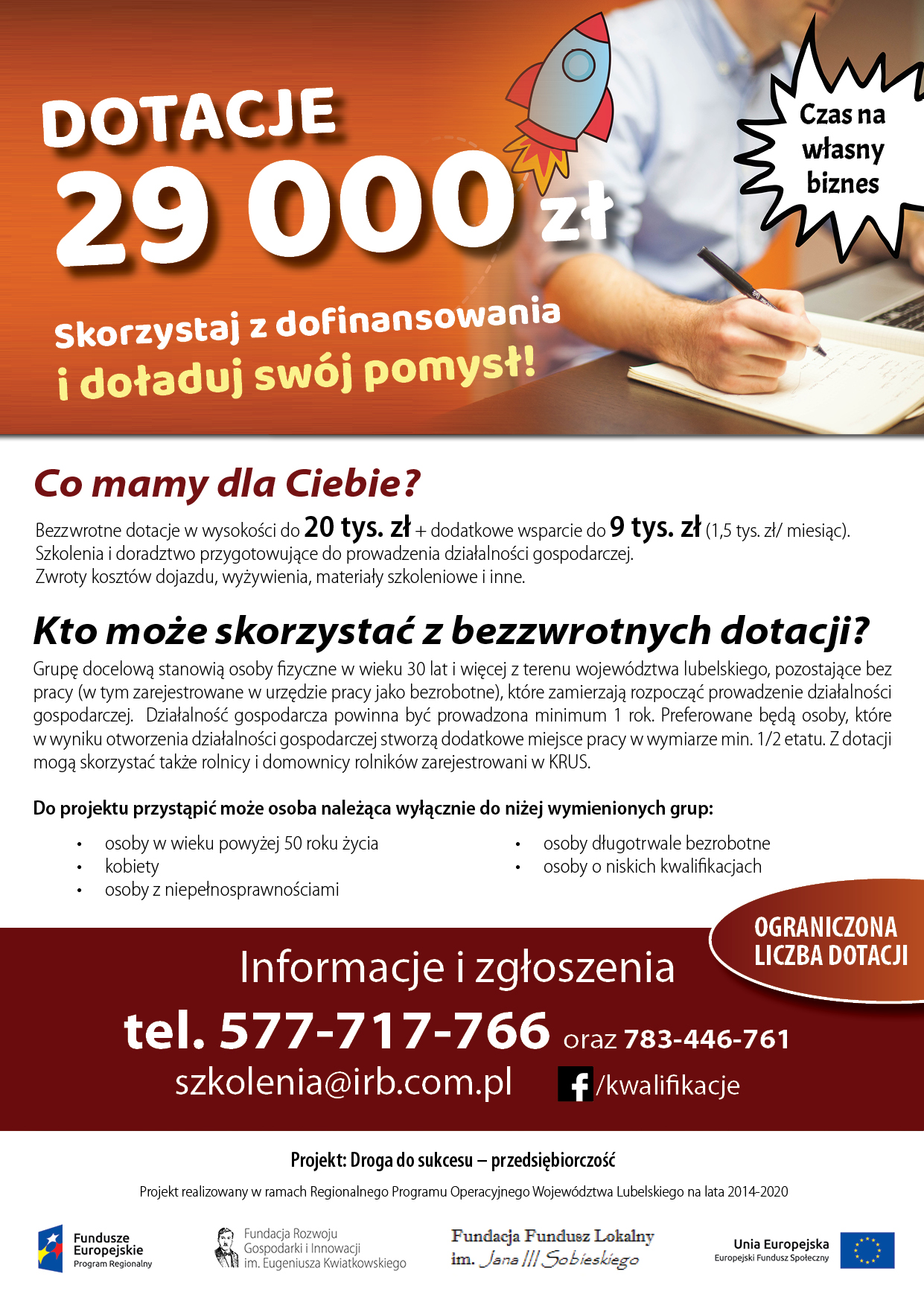 Coraz więcej Polaków bierze sprawy w swoje ręce i zakłada firmy. Ty też marzysz o tym, aby założyć własną działalność gospodarczą? Chcesz samodzielnie kreować swoją biznesową przyszłość, ale nie wiesz od czego zacząć? Zgłoś się i skorzystaj z dofinansowania w ramach projektu “Droga do sukcesu – przedsiębiorczość”.