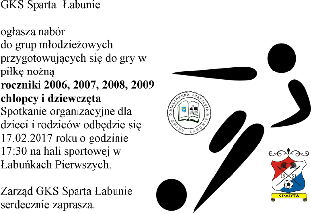 GKS Sparta Łabunie rusza z naborem do grup młodzieżowych przygotowujących się do gry w piłkę nożną. Zapisywać się mogą chłopcy i dziewczyny z roczników od 2006 do 2009. W tej sprawie w piątek (17 lutego) odbędzie się spotkanie dzieci i rodziców. Początek – godz. 17:30, na hali sportowej w Łabuńkach Pierwszych.