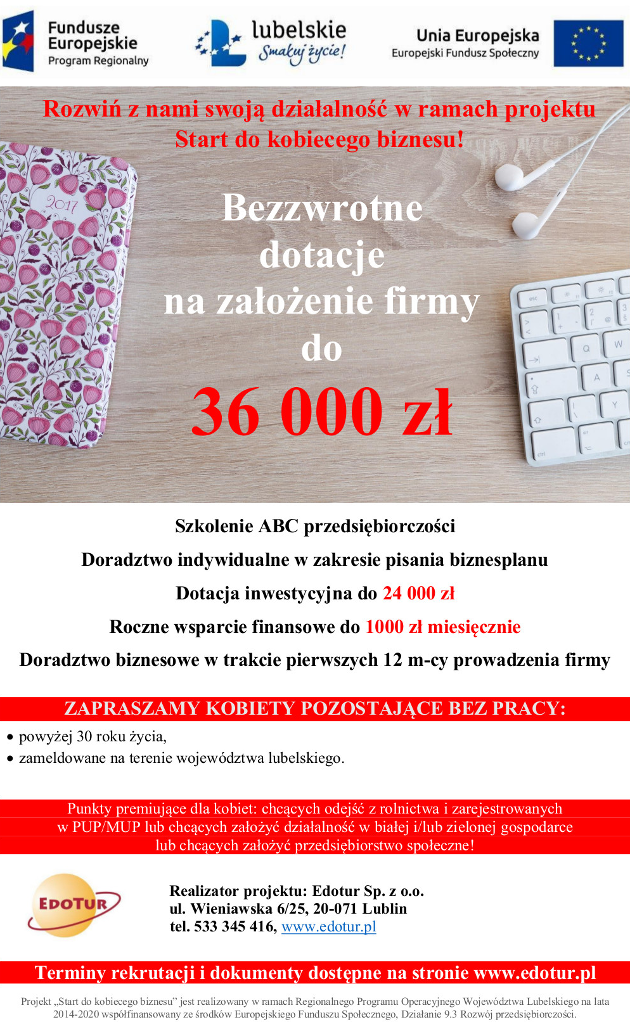 Projekt skierowany jest do kobiet powyżej 30 roku życia, pozostających bez pracy (bezrobotnych, poszukujących pracy i/lub biernych zawodowo), zamieszkujących na terenie województwa lubelskiego zamierzających założyć działalność gospodarczą i prowadzić ją przez minimum 12 m-cy.