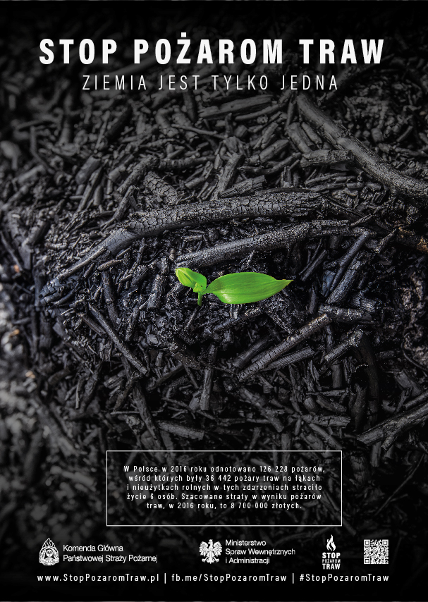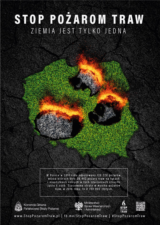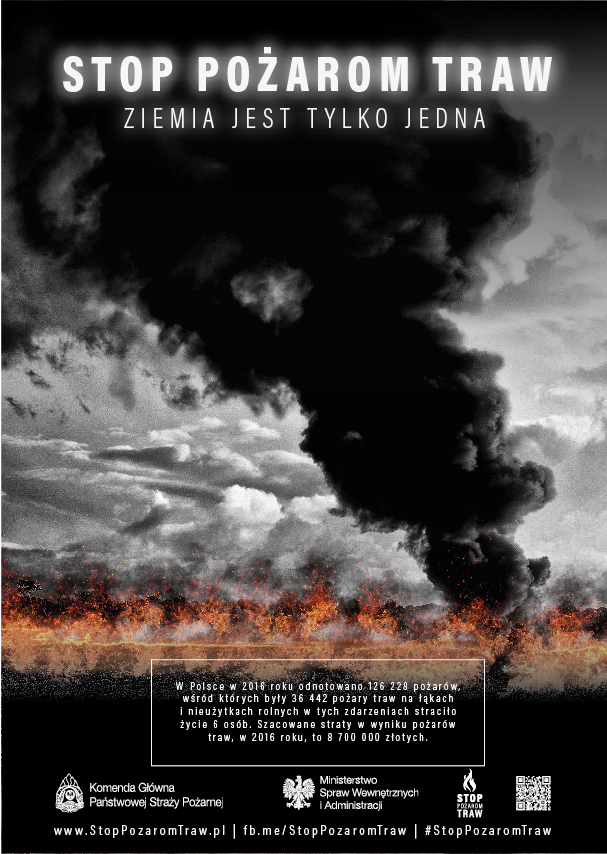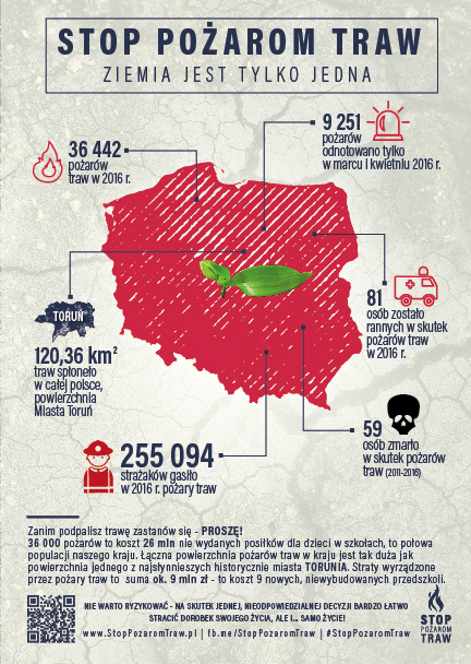 Zanim podpalisz trawę, zastanów się – PROSZĘ! 36 tys. pożarów to koszt 26 mln nie wydanych posiłków dla dzieci w szkołach. To połowa populacji naszego kraju. Łączna powierzchnia pożarów traw w kraju jest tak duża jak powierzchnia Torunia. Straty wyrządzone przez pożary traw to ok. 9 mln zł. To koszt 9 nowych, niewybudowanych przedszkoli! |
