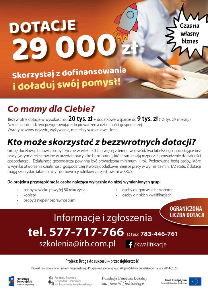 Mieszkańcy naszej gminy mają szansę na dotację do 29 000 zł w ramach projektu unijnego. Dotacja jest bezzwrotna i mogą z niej skorzystać osoby spełniające wymogi uczestnictw w projekcie. Razem z dotacją osoby biorące udział w tym projekcie otrzymają szkolenia i doradztwo przygotowujące do prowadzenia działalności gospodarczej. Organizatorzy projektu opłacają zwroty kosztów dojazdu, wyżywienia, materiały szkoleniowe i inne.
