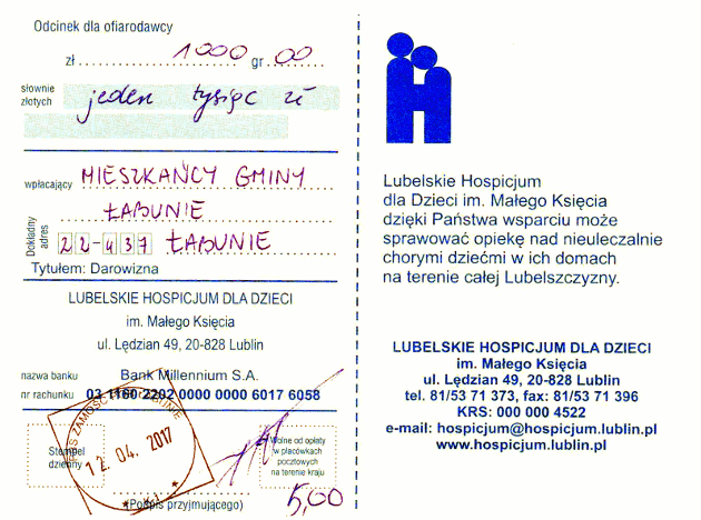 Ostateczna kwota którą zebraliśmy: 1000,00 zł. Pieniądze zostały przekazane na konto Lubelskiego Hospicjum dla Dzieci im. Małego Księcia.