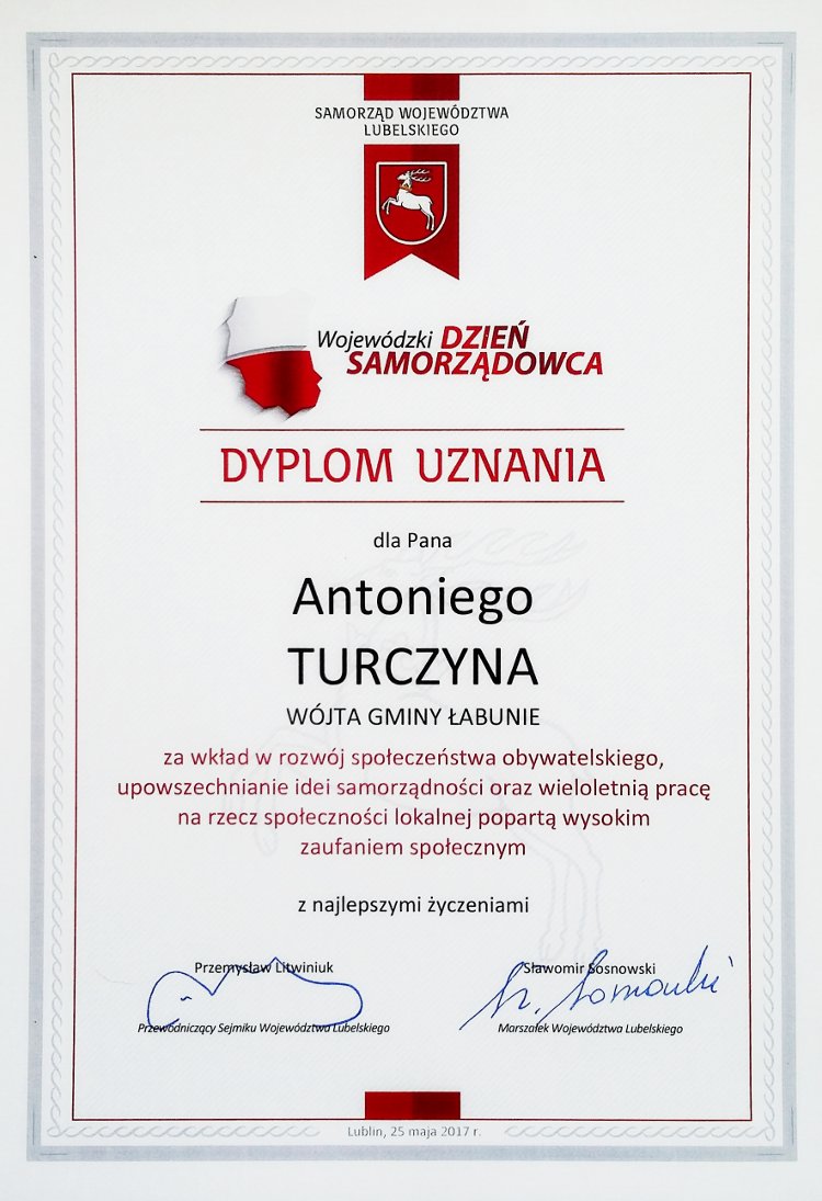 Wśród 75 wyróżnionych był Wójt Gminy Łabunie Antoni Wojciech Turczyn.