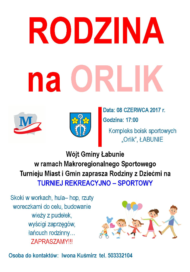 Wójt Gminy Łabunie zaprasza 8 czerwca 2017 r. od godz. 17:00 na kompleks boisk sportowych “Orlik” w Łabuniach. W ramach Makroregionalnego Sportowego Turnieju Miast i Gmin rozegrany zostanie turniej rekreacyjno-sportowy dla Rodzin z Dziećmi.