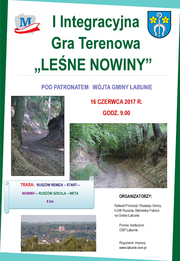 Wójt Gminy Łabunie serdecznie zaprasza do udziału w I Integracyjnej Grze Terenowej “LEŚNE NOWINY”. Trasa wiedzie malowniczymi wzgórzami Roztocza. W 7 bazach na 8 kilometrowej trasie oczekiwać na was będą bohaterowie bajek, m. in. Czerwony Kapturek, Baba Jaga, ale i Skarbnik Leśnych Nowin, który nauczy was liczyć pieniądze. Będzie radośnie i bardzo tajemniczo.
